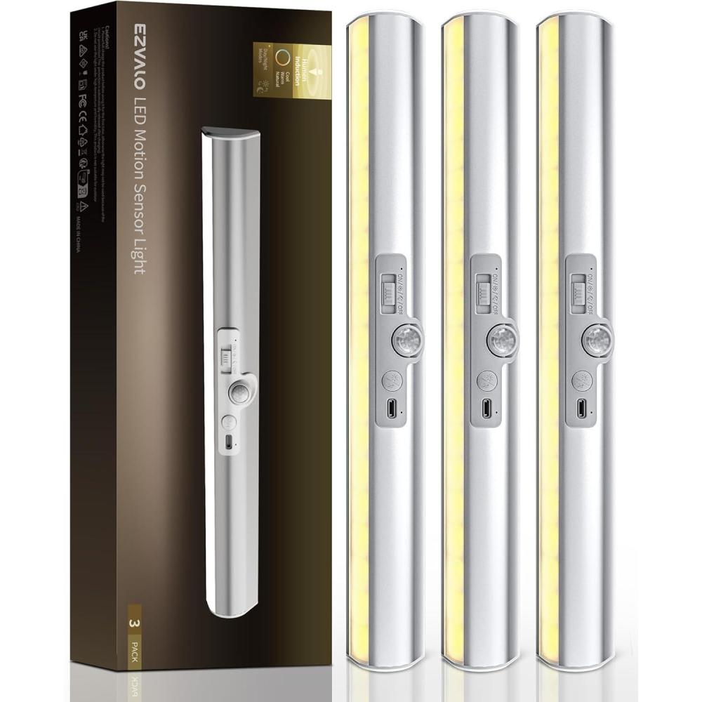 EZVALO Motion Sensor Closet Lights, 2 Pack Rechargeable LED Lights with Rotatable Sensor, Glare-Free, 3 Color Temps & Dimmable, Magnetic Under Cabinet Lighting for Closet, Pantry(3Pack)