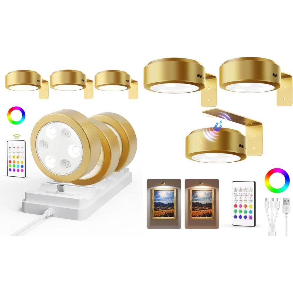 EZVALO Picture Lights for Wall,2000mAh Rechargeable Battery Magnetic Poster Lights with 2 Color Temps&12 RGB,Remote Dimmable Timer Painting Light,Wall Decor Light for Art Display,Picture,Frame(6 Pack)(Gold)