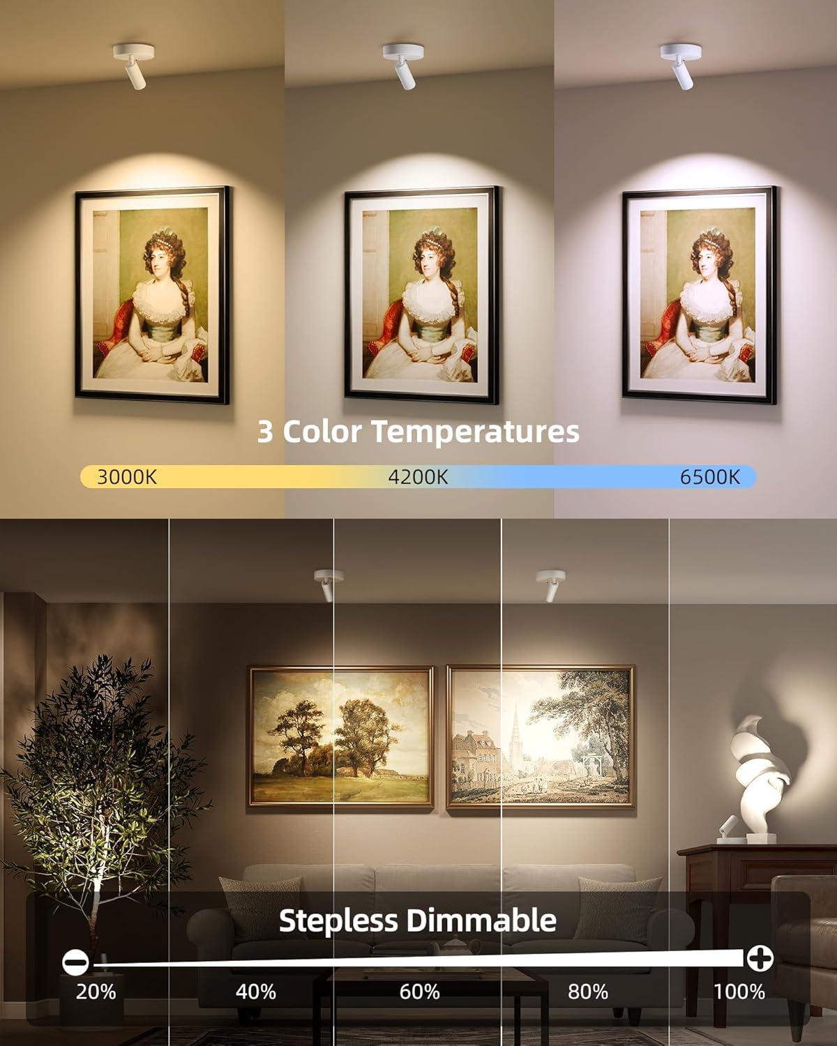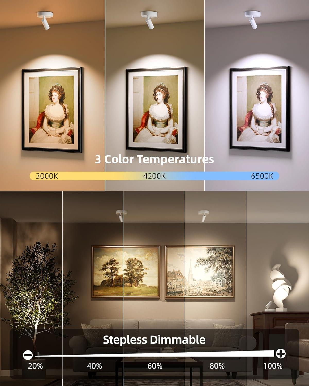 2.Two Control Modes: EZVALO LED Picture light for wall provides remote and button control, You can use the button on the wireless spotlight indoor to power on/off with single click, double click to cycle through color temperatures (3000K-4200K-6500K), long press for smooth dimming (10%-100%) The accent light remote control also includes a timer function (15min, 30min, 45min, 60min, 120min)