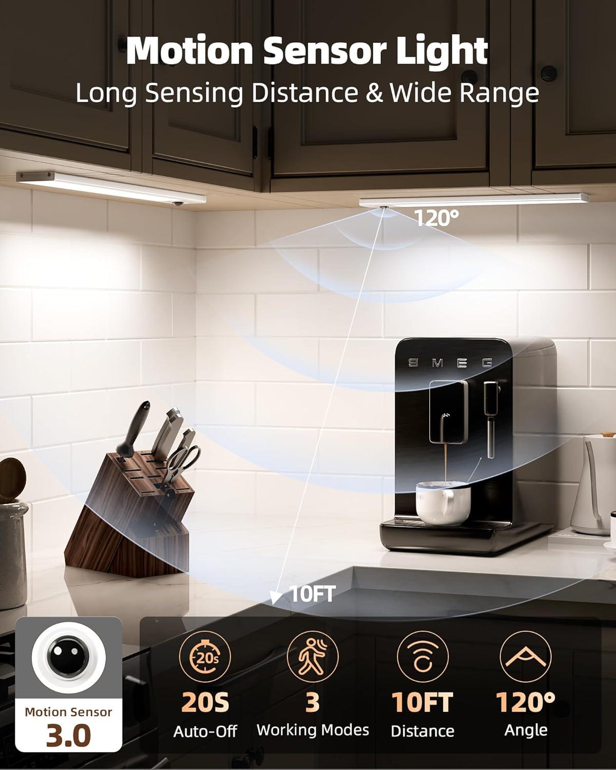 Smart Motion Sensor & Three Modes: This motion sensor light indoor detects movement from up to 10 feet with a wide 120° detection angle. Once the sensor no longer detects motion for 20 seconds, the light will automatically turn off, providing energy-efficient operation. Always-On mode for continuous illumination, All-Day mode for automatic sensing throughout the day, and Night Mode for efficient nighttime use.